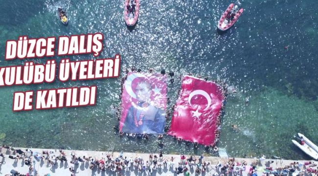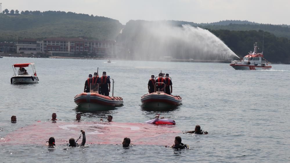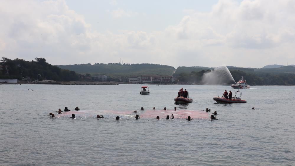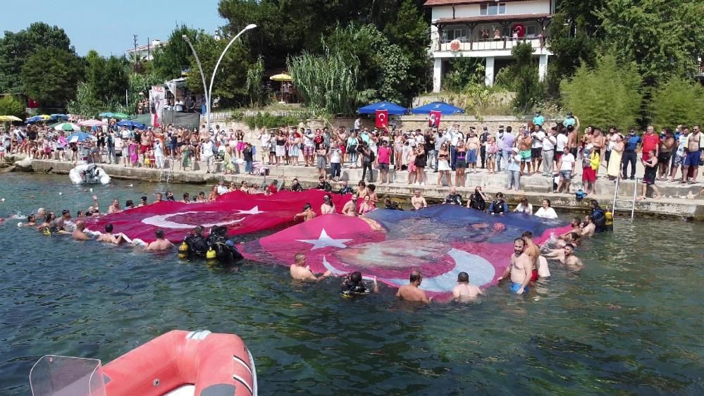 Kocaeli'nin Kandıra ilçesinde Deniz Yıldızları Sualtı Sporları Kulübü üyeleri, 30 Ağustos Zafer Bayramı'nın 99'uncu yıl dönümünü kutlamak için Kerpe sahili açıklarında dev Türk bayrağı ve Atatürk resmi açtı.Etkinliğe Düzce Dalış Kulübü üyeleri de katıldı.