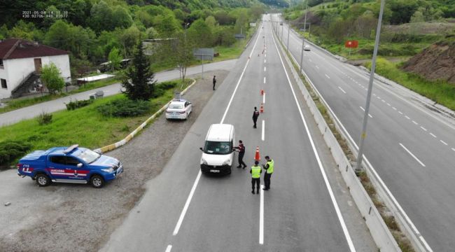 Düzce İl Jandarma Alay Komutanlığı ekipleri şehrin giriş ve çıkışlarında drone destekli tam kapanma denetimlerini sürdürüyor.