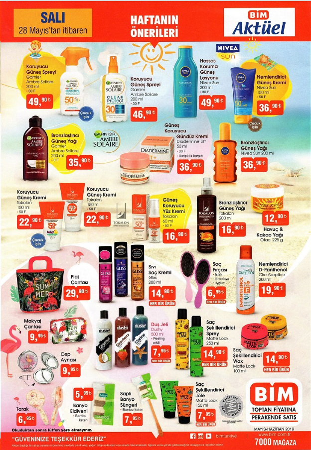 27. Garnier Koruyucu Güneş Spreyi (200 ml) 49,90 TL. 28. Garnier Koruyucu Güneş Spreyi (200 ml) 46,90 TL. 29. Nivea Sun Hassas Koruma Güneş Losyonu (200 ml) 49,90 TL. 30. Nivea Sun Nemlendirici Güneş Kremi (200 ml) 36,90 TL. 31. Garnier Bronzlaştırıcı Güneş Yağı (200 ml) 35,90 TL. 32. Diadermine Lift Güneş Koruyucu Gündüz Kremi (50 ml) 36,90 TL. 33. Comfort Kız Çocuk Külotlu Çorap 3,50 TL. 34. Comfort Kadın İnce Trend Çorap 3,50 TL. 35. Comfort Kadın Kalpli Suba Çorap 2,50 TL. 36. Comfort 3'lü Family Erkek Soket Çorap 9,95 TL. 37. Parfümlü Tuvalet Kağıdı 24 Rulo 29,90 TL.