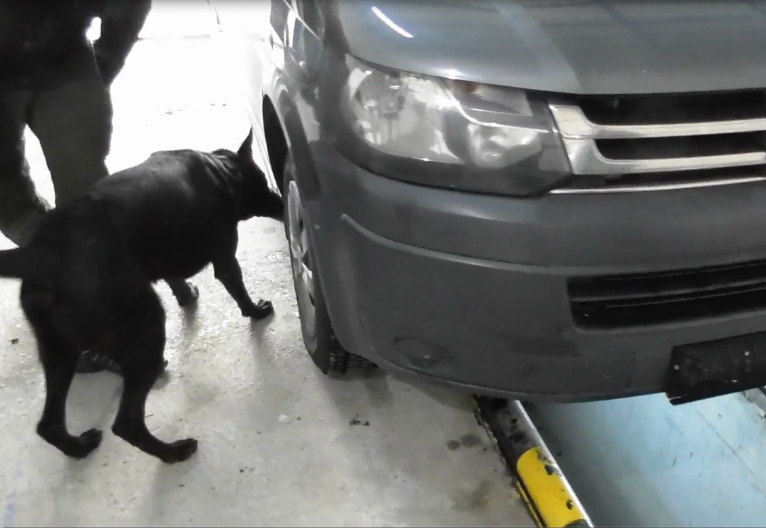 üzerinde durdurulan bir minibüste Narkotik Madde Arama Köpeği Shadow ile